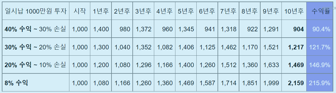 | 성장성 | 낮음 | 높음 (복리 효과) |